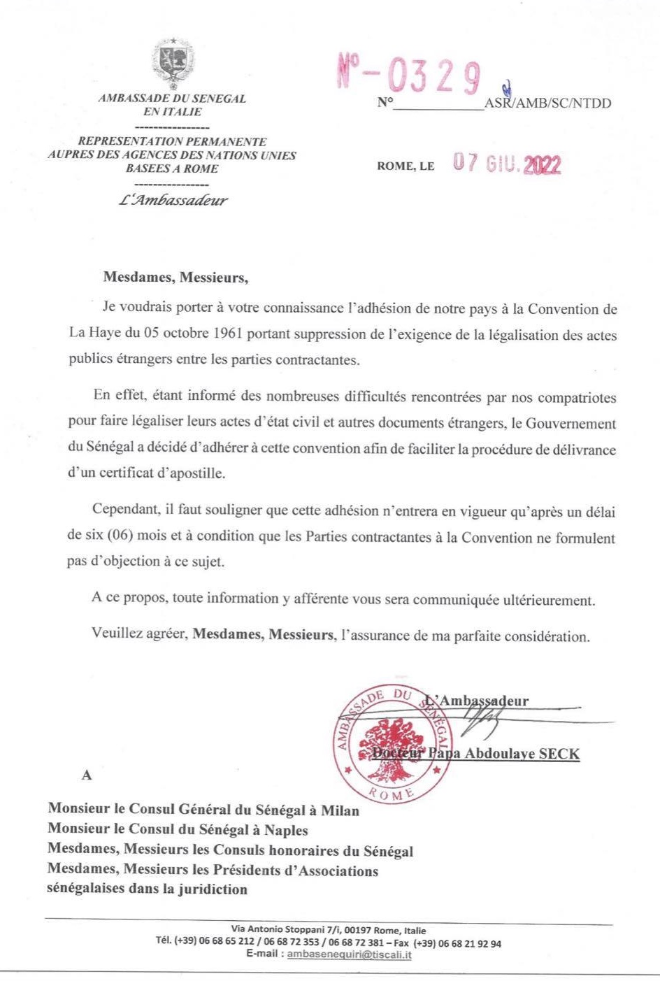 Le Sénégal a adhéré à la convention de la Haye du 05 octobre 1961 portant suppression de l’exigence de la légalisation des actes publics étrangers entre les parties contractantes. Cette adhésion entrera en vigueur dans 6 mois à moins que les parties contractantes à la Convention ne formulent pas d'objection.